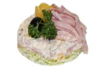 Говядину и ветчину порезать тонкой соломкой. Грецкие орехи измельчить на мелкие кусочки. Апельсин очистить от кожуры и пленок и порезать небольшими кусочками. Все сложить в салатник. Добавить майонез. Украсить порезанной зеленью петрушки и лука-порея.