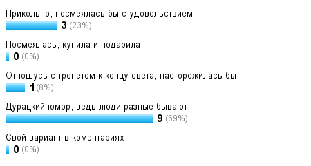 Сегодня пришла коллега на работу и выдала новость: в двух магазинах видела набор для конца света: бутылка водки, консерва, кг гречи, веревка и мыло. Она смеялась, а мне почему-то противно стало. Что это? У меня с чувством юмора плохо? Я понимаю не хочешь - не покупай, но я все ровно не понимаю такой Юмор.