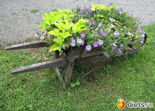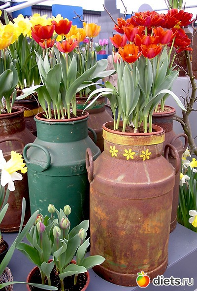 Вдохновленная расписными бочками NIKO и продолжая тему украшение сада, тему тюльпанов и других цветов, выкладываю еще несколько фото с оригинальным применением садового инвентаря, горшков, посуды, подвесных корзин