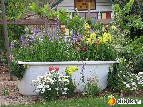 Или вот такое использование ванны - не в качестве емкости для воды, а в качестве вазона или высокой клумбы: