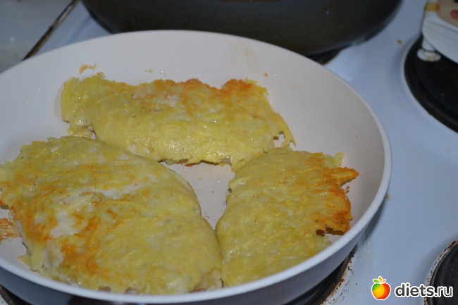 куриные грудки макать в картофель (я прямо немного ладошкой еще сверху накладывала), обжарить на сухой сковороде (или почти на сухой) с двух сторон.