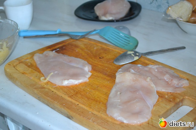 куриные грудки разрезать вдоль, отбить, посолить, поперчить
