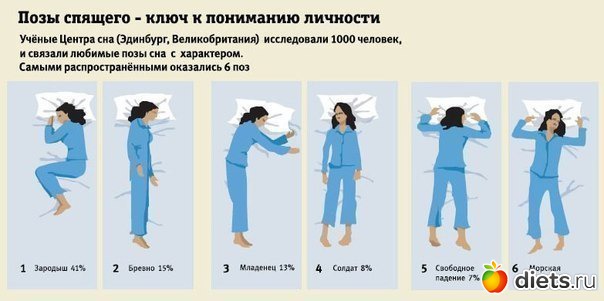 1. Эмбрион - Некоторые люди скручиваются калачиком и спят в такой позе, очень напоминающей позу эмбриона в утробе матери. Такие люди обычно сильные, целеустремленные и порой жестокие, но это только внешняя оболочка. Внутри такие люди очень чувствительны и ранимы. Иногда они стесняются при встрече и разговоре с незнакомым человеком, но через некоторое время приходят в норму и чувствуют себя довольно комфортно. Так спит примерно 41% из 1000 опрошенных. Стоит подчеркнуть, что в такой позе спят больше женщины, нежели мужчины...