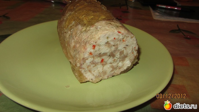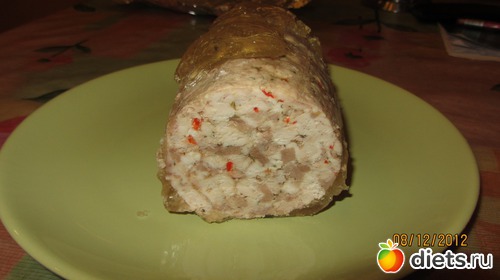 Ингредиенты :1,8кг бедер куриных, 500 гр грудка индейки, 300гр вареного языка 1/4 перца болгарского. желатин 30 гр, соль, перец, специи.