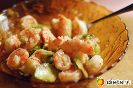 Мякоть авокадо нарезать средними кубами и побрызгать соком лимона. Грейпфрут почистить от кожицы, нарезать кубиками и смешать с майонезом. Перемешать грейпфрут с авокадо, выложить в салатницу, сверху выложить креветок и украсить зеленью укропа.