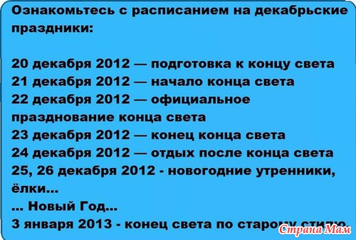Муж мой переживает из-за конца света, все передачи смотрит по телевизору про Апокалипсис, я с него угораю