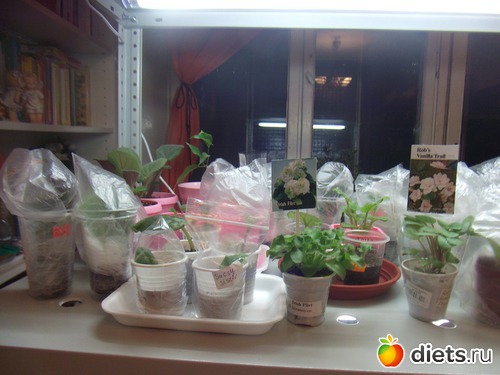 На стеллажах сейчас в основном прорастают новые фиалки и растут старые. А остальные цветы на подоконниках.