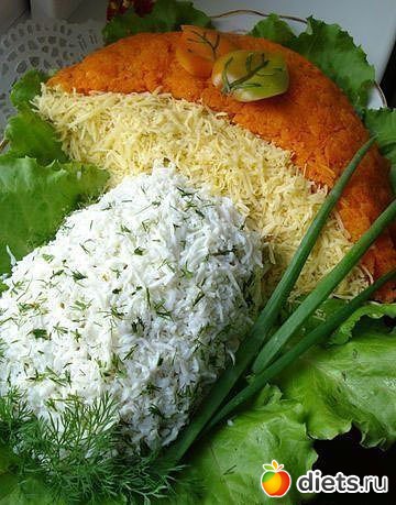 или сметану, посолить по вкусу. Выложить на блюдо, придав форму грибочка, ножку оформляем тёртым на мелкой тёрке белком (присыпать укропом), шляпку-варенная морковь потёртая на мелкой тёрке, низ шляпки сыром тёртым.