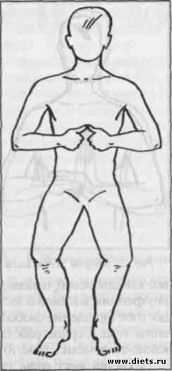 Если исполнение этого жеста силы продолжить, то постепенно тепло заполнит все тело и дойдет до ступней ног. В теле будет приятное, мягкое, расслабляющее тепло, а в ступнях ног появится жар. Он тем сильнее, чем дольше мы стоим, выполняя первый жест. Поэтому существует некий предел терпения, для каждого человека индивидуальный. Когда жар в ступнях станет сильным, почти нестерпимым, упражнение прерывается... (рис. 7)