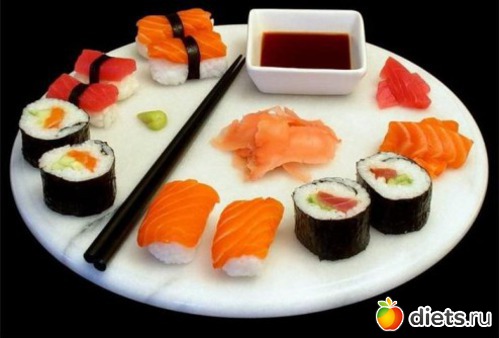 *Суши-ланч (асорти)*- 1 обычная порция 330 кал; Жиры-3 г; Углеводы-56 г; Белки-20 г
