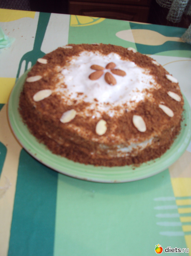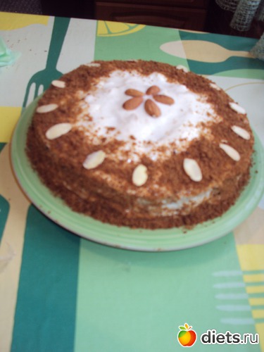 Все, кроме муки перемешать, поставить на водяную баню, пока масса не увеличится в 2 раза. Добавить муку, и отставить остывать. Когда остынет, разделить на 6 шариков. У меня раскатывалось лучше, охлажденное тесто. Присыпать мукой стол, раскатать аккуратно коржи, выложить на пергаментную бумагу, смазанную раст. маслом. Тесто трудновато было перекладывать на протвень. Можно его руками по круглой жаропрочной форме распределить. Выпекать до золотисто - коричневого цвета, несколько минут в духовке.