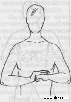 Второй жест силы напоминает первый с той разницей, что ладонь правой руки накрывает сверху сжатые в кулак пальцы левой руки. Локти разведены в стороны, глаза закрыты, подушечки больших пальцев соединены и оба пальца направлены на грудину, внимание сосредоточено на ощущениях левой стороны тела. Во время исполнения этого жеста силы раскачивания уже не будет. Но появится неожиданное и непривычное чувство, что в левой стороне тела открываются все каналы и мягкое живительное тепло волной поднимается от стопы левой ноги вверх к колену, потом к тазобедренному суставу, течет по левому боку и руке, наполняет левую сторону шеи и левую половину головы. Когда пульсирующее тепло заполнит левую половину головы, у нас появится возможность по чувствовать, как все каналы и меридианы слева наполнены энергией, которая пульсирующим устойчивым ручьем струится по энергетическим магистралям.