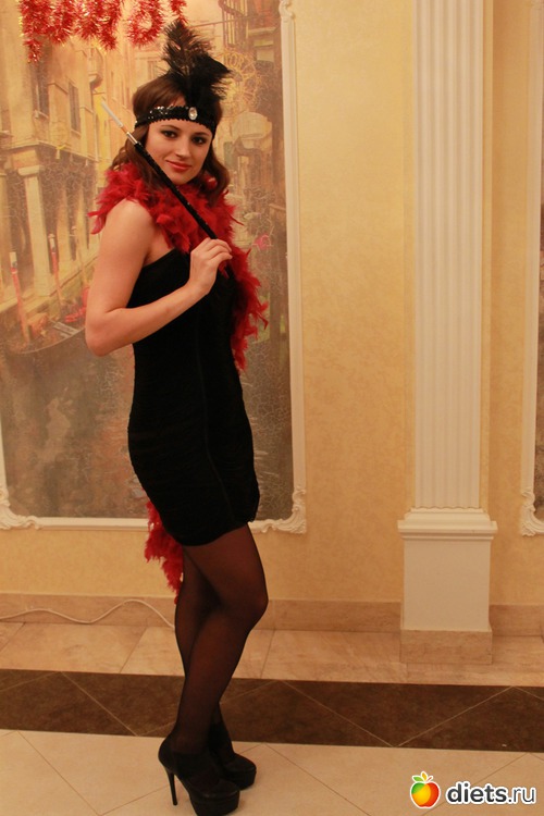 Я для этого купила мундштук, боа, перо на голову. Платье у меня было короткое для образа, но оно единственное, которое было "в тему". Я сделала яркий макияж (предварительно смотрела видео и читала статьи о макияже и прическе того времени), сделала ретро-волны (правда не очень получилось).