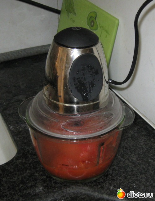 Чуть проварить помидоры, или просто подержать в горячей воде-чтобы легче было снять шкурку. Тоже мелко накорошить или намять, короче-сделать пюре.