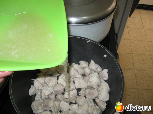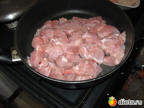 Сначала промыть и порезать на маленькие кусочки мясо.обжарить его на сухой сковороде, под крышкой, всё время сливая сок в отдельную миску.