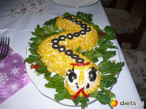 Салат потрясающий, я стесняюсь спросить сколько времени ушло на выкладывание змеиной шкуры кукурузой?