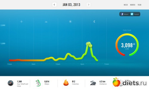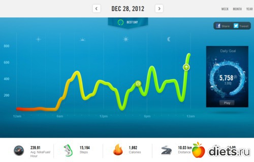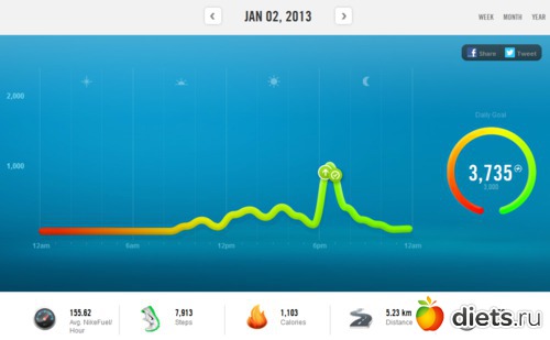 Единственное, что мне не нравится в браслетике - это то, что он не считает калории, когда я сплю, поэтому к дневной норме, которую он насчитал нужно прибавлять еще 350 ккал. Внизу идет подсчет ккал, шагов, пройденного расстояния, активного состояния и очки найк, за которые на сайте дают символические видеонаграды.