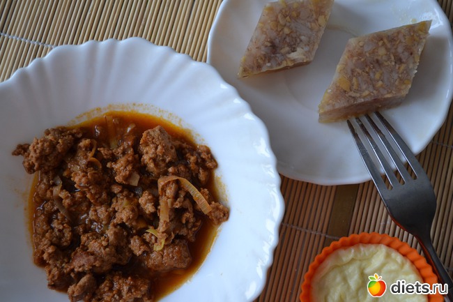 обед мой: фарш а-ля болонезе, немного холодца с нового года, омлетик и еще чашечка кофе с молоком
