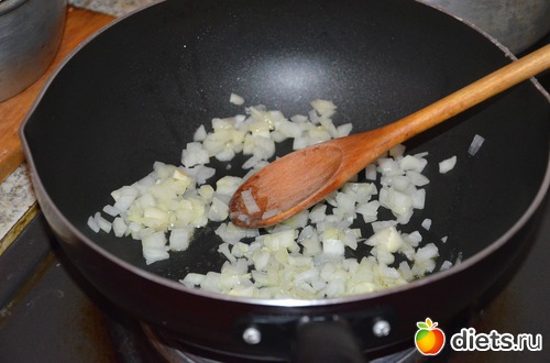 1. Сковороду поставить на средний огонь, положить половину сливочного масла, мелко нашинкованный лук и чеснок пассеровать до прозрачности.