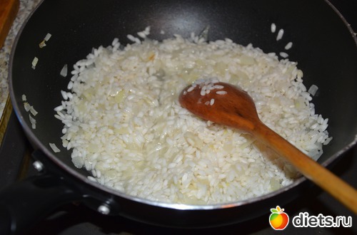 5. Теперь аккуратно по 1 половнику добавляем бульон, щепотку соли и размешиваем ризотто, бульон должен частично впитаться и частично выпариться. Так повторяем несколько раз, пока рис не будет готов (на это уйдет около 15 минут). По консистенции ризотто должно быть похоже на кашу, не слипшееся. Если бульон закончился а ризотто еще не готово, добавляйте кипяток.