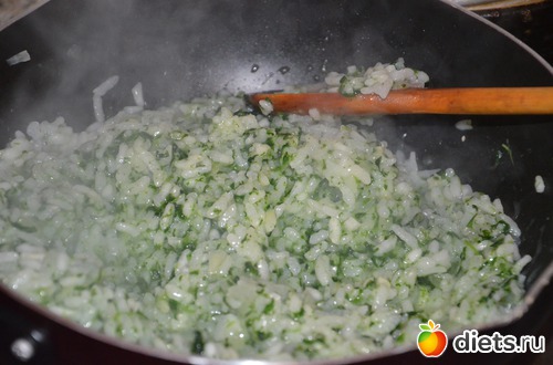 6. Размороженные кубики шпината отжимаем, чтобы удалить излишнюю влагу. Добавляем к ризотто, тщательно размешиваем. Добавляем оставшуюся половину сливочного масла, тертый сыр, как следует размешиваем, снимаем с огня. Накрываем крышкой и даем постоять 2 минуты.
