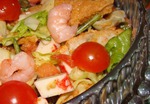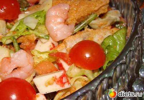 Все осторожно перемешиваем и украшаем креветками и половинками черри.
