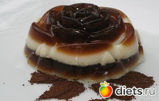 В формочки налейте слой кофейного, охладите, затем молочного желе, затем снова слой кофейного желе, охладите. Операцию повторите, чтобы получилось несколько слоев молочного и кофейного желе. Перед подачей формочки на несколько секунд опустите в горячую воду, затем, перевернув, выложите желе на блюдо.