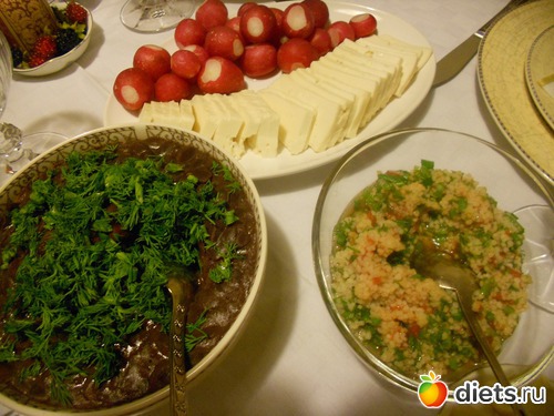 На столе вы видите зеленый салат, табуле, лобио, армянский сыр чанах, редиску, думаю, и так узнали.