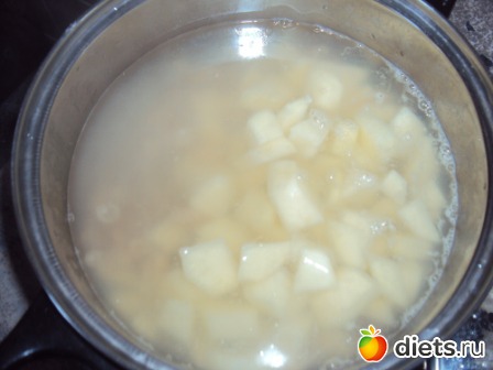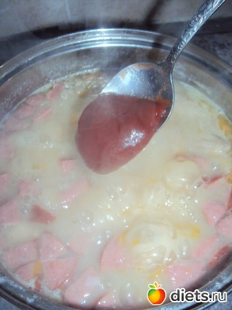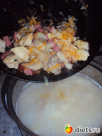 Даем картофелю повариться минут 7 и добавляем в суп нашу тушенную заправку