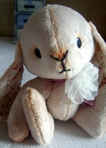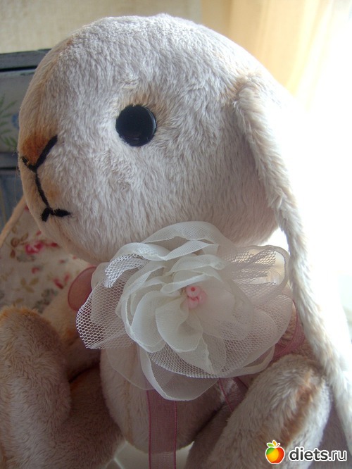 Зайка сделана из искусственного меха, слегка тонирована, нитяное крепление лап, голова пришита. Может стоять и сидеть! Цветок - украшение тоже сделан мною из органзы и сетки. Внутренняя сторона ушек из льна. Рост 23 см.