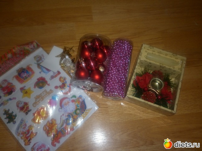 Вот подарки для нашей елочки...бусами тут же обновили нашу елочку. Наклейки дочери. Говорит пусть до следующего НГ лежат.