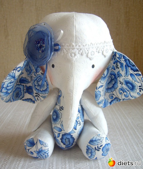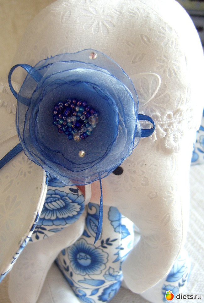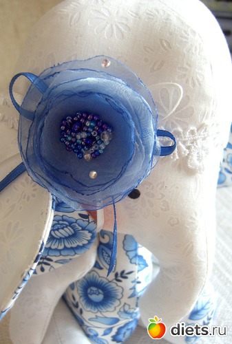 Идея создания этого слоника родилась одним морозным утром, когда я увидела подсвеченные голубым светом узоры на стекле. Отсюда и название. Слоник может быть игрушкой для детей постарше так как в сердцевине цветка много бисера - для маленьких будет опасно! Но особенно такой подарок оценит любительница гжель.