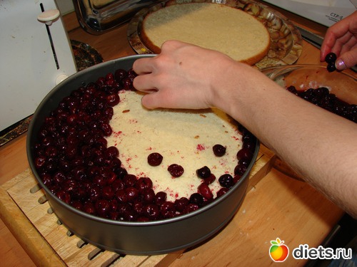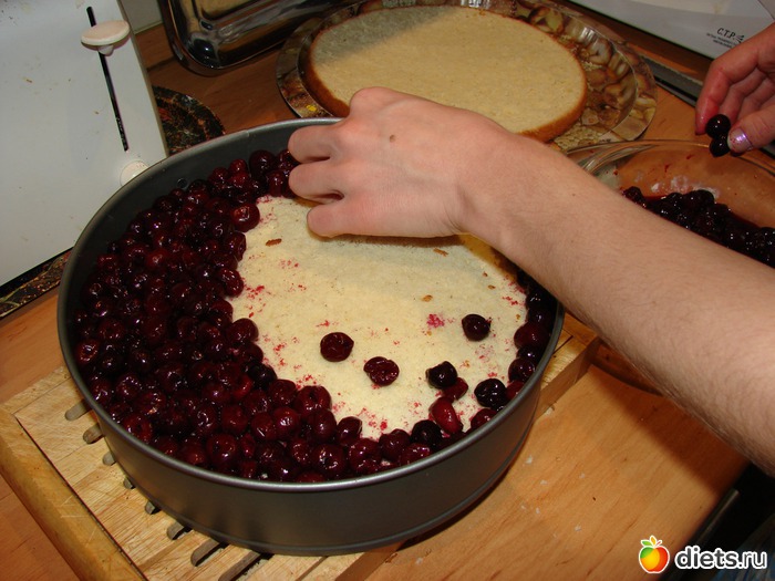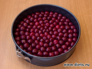 Выложить на корж вишню. Если коржа два и вишни анм понадобится в 2 раза больше.