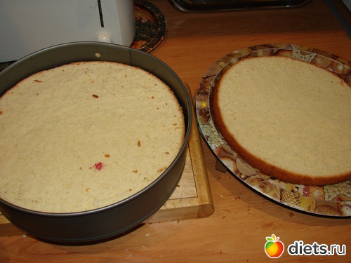 Есть варианты: я делаю корж из 4 яиц (по 200 г.муки и сахара) и разрезаю его пополам: