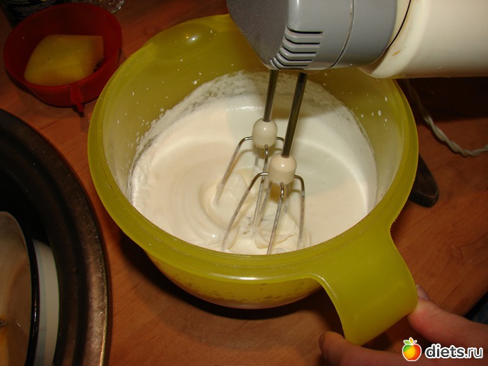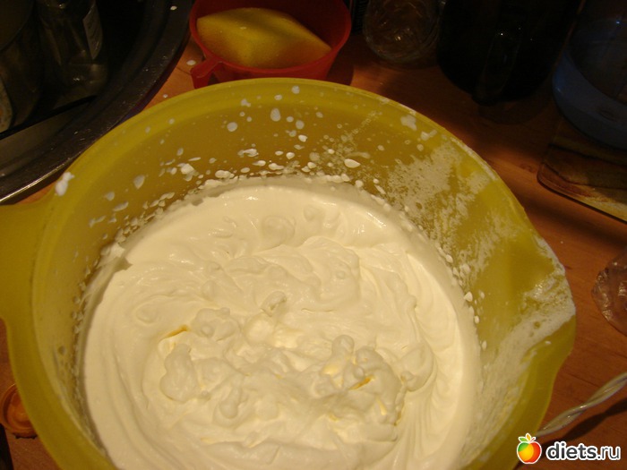 Приготовить крем. Для этого сливки взбить с сахаром.