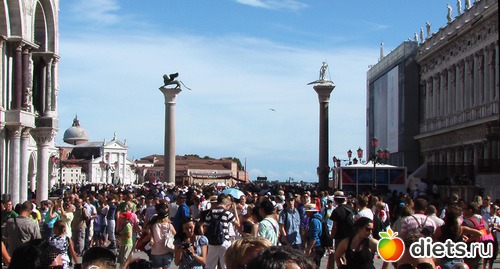Недалеко от набережной на площади возвышаются две колонны, привезенные в Венецию с восточного побережья Средиземного моря в 1170 г.,