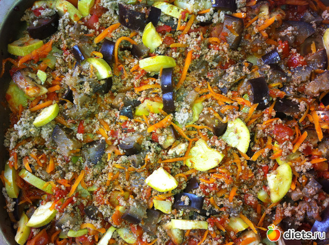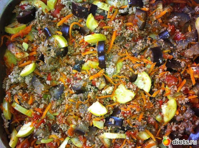 Если мясо сырое, делаете из него фарш и сразу кладете на протвень 2-ым слоем, между овощами и томатной пастой.