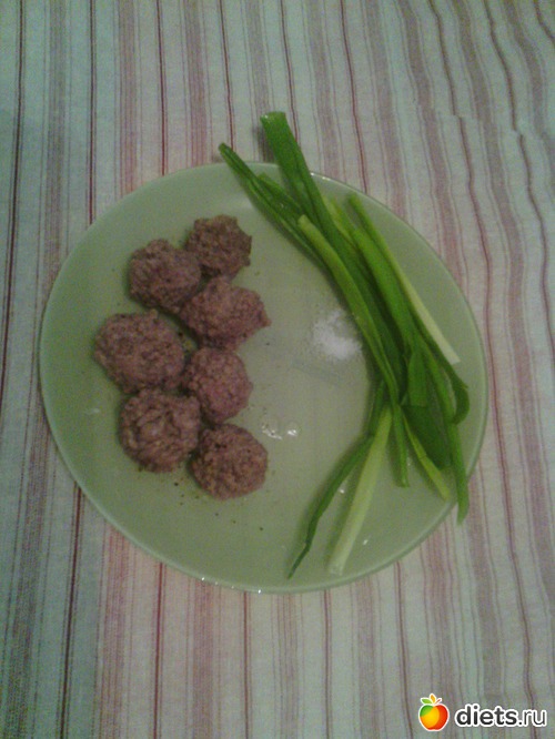 зеленый лук, фрикадельки из говяжьего фарша, отваренные в соленой воде.