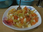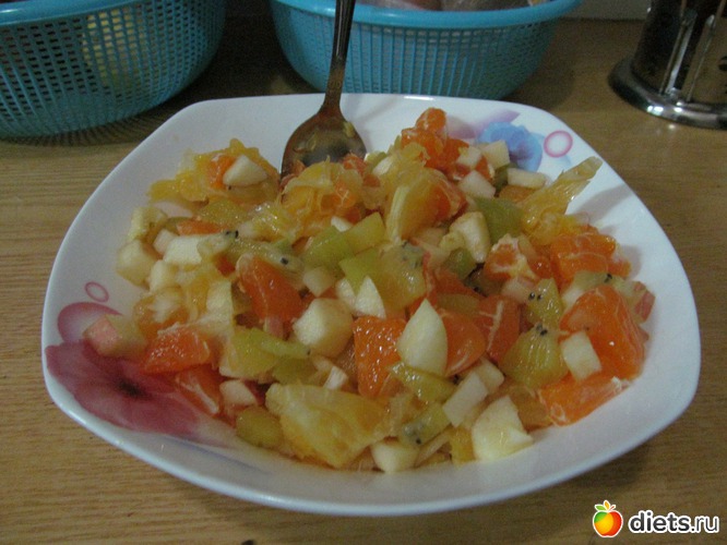 Рецепт прост до безобразия: Все мелко нарезать и смешать, а сверху полить соком, который остался, когда вы нарезали фрукты - поверьте, останется его много. Вкуснота неописуемая