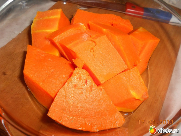 1 - запекаем тыкву, примерно 300 грамм, очищенную и порезанную на крупные кусочки.