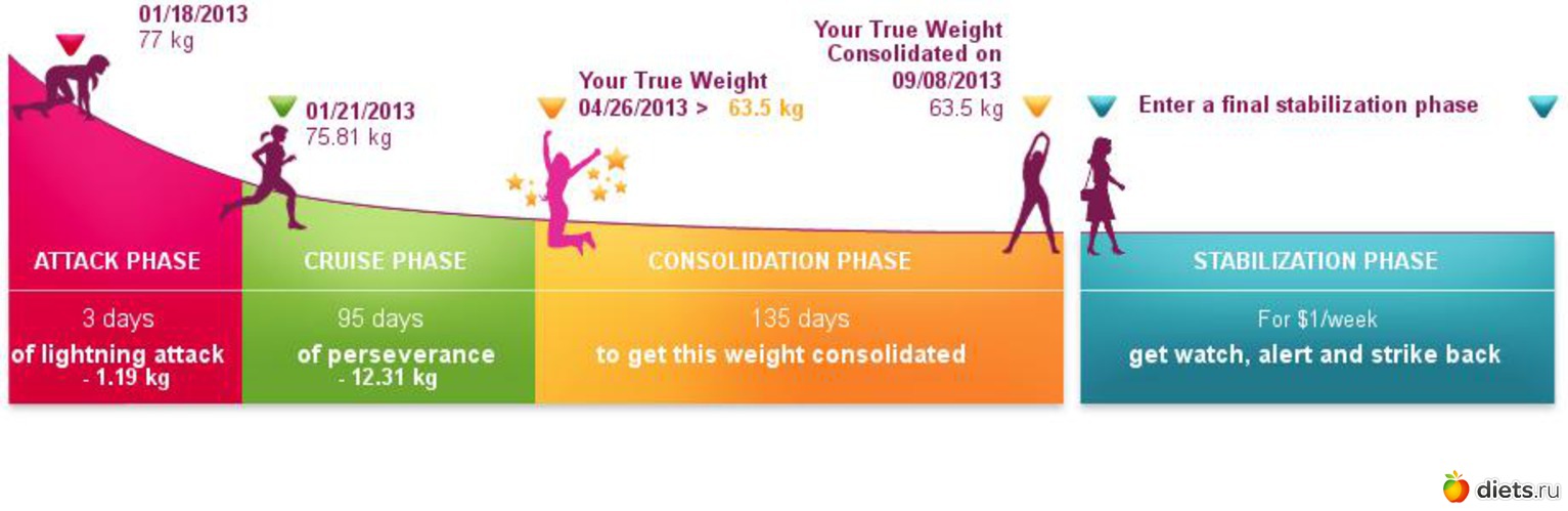 Приветик всем!!! Я сегодня получила линеечку Дюкана, там слегка всё по-другому, не так как я себе планировала. Я думала о конечном весе 60, но сомневалась в правильности такой цели, из-за возраста. Есть примеры подруг, которые стройнели грандиозно