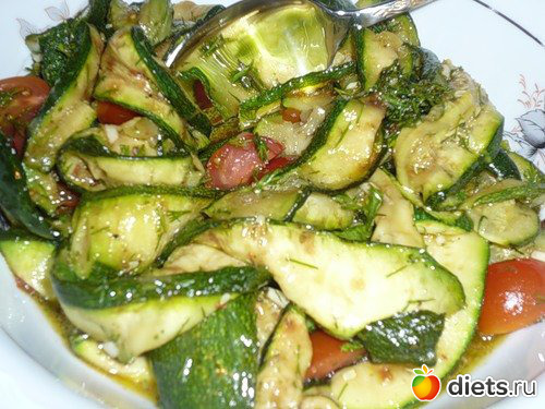 Салат из запеченых цуккини Цуккини нарезать тонкими лентами, посолить, посыпать приправой для салатов и оставить на 10 минут мариноваться. Затем обжарить цуккини на гриле или в сквороде-гриль с добавлением раст. масла без запаха. Обжаренные цуккини сложить в миску, добавить мелко нарезанный чеснок, укроп, дабавить бальзамический уксус и оливковое масло. Осторожно перемешать и оставить на пару часов. Нарезать на половинки помидорки-черри, добавить к маринованным цуккини и перемешать.