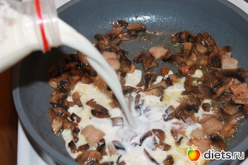 Грудинку режем и обжариваем вместе с порезанными шампиньонами,