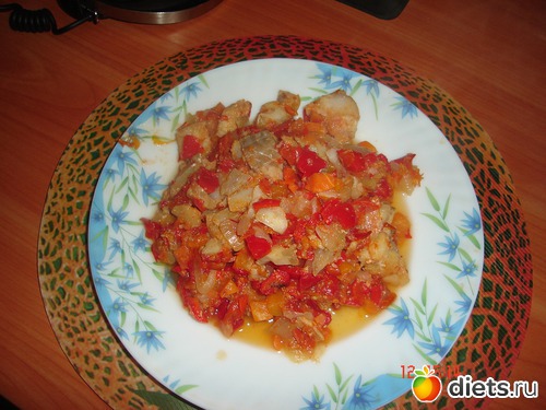Закинула замороженные овощи в кастрюлю, сверху закинула размороженный и порезанный на кусочки минтай, овощи дали воду необходимую для тушения, вот так я получила порцию диетической вкуснятины