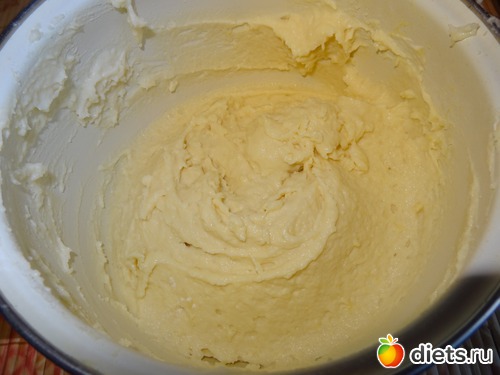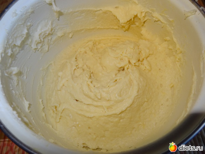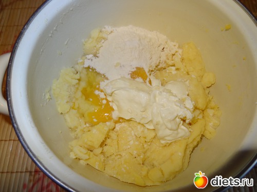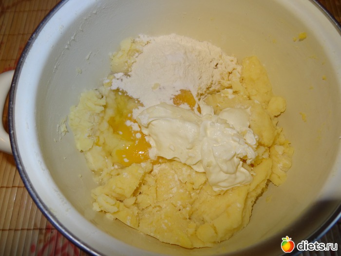 В пюре положила яйцо, сметану, муку и чуть-чуть соды. Смешала.