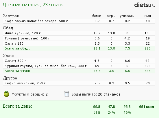 Итак, 1 день мое питание по диете и + нарушение такое как стакан кефита на ночь, не думаю что сильно нарушила так как это тоже белок + для желудка полезно ))))