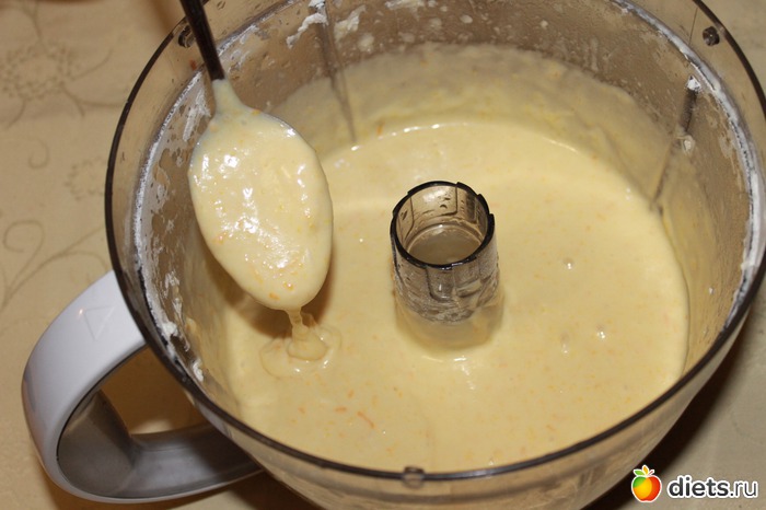 Масло взбиваем с сахаром до кремообразного состояния и расстворения сахара. Добавляем яйца по одному, просеянную с разрыхлителем муку, цедру и сок. Все еще раз хорошо перемешать до образования однородной массы. Можно на низких оборотах миксера.