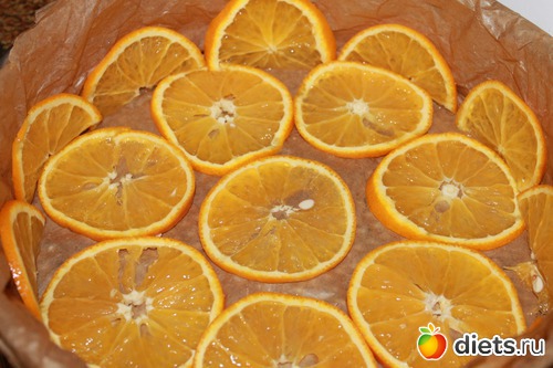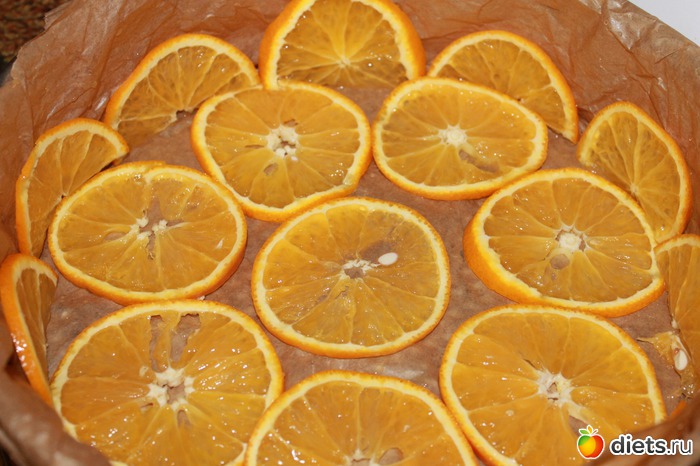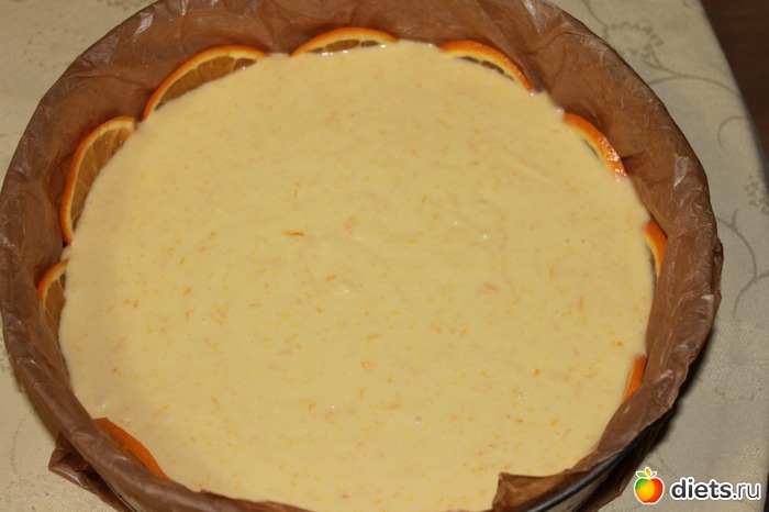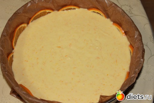 Бумагу для выпечки хорошенько намочить и отжать. Выстелить форму бумагой для выпечки, дно и бока формы выложить кружочками апельсинов. На бока апельсиновые кружочки режем половинками.
