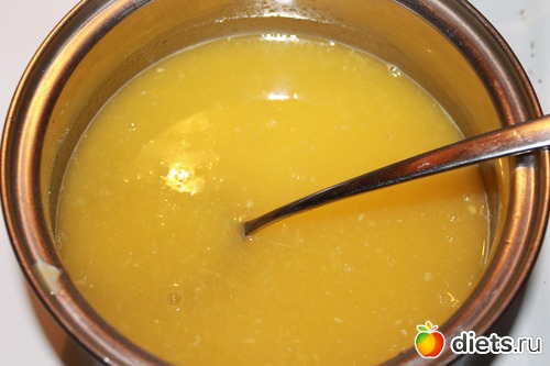 Сироп: Сок и сахарную пудру смешать в кастрюльке, довести до кипения и варить сироп 5 минут.
