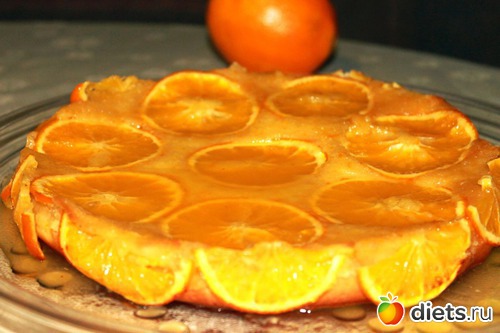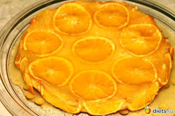 Вынуть пирог из духовки, перевернуть на блюдо, снять разъемную форму, часто потыкать шпажкой, чтоб лучше пропитывался и сверху, еще теплый полить апельсиновым сиропом.